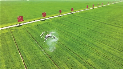 近年來,江蘇省宿遷市宿豫區(qū)多措并舉推動耕地保護責任落實,加快現(xiàn)代農(nóng)業(yè)產(chǎn)業(yè)園核心區(qū)建設(shè),保障糧食穩(wěn)產(chǎn)增產(chǎn)。圖為近日,在該區(qū)新莊小麥單產(chǎn)提升示范區(qū),無人機正在進行植保噴灑作業(yè)。朱冠軍 攝