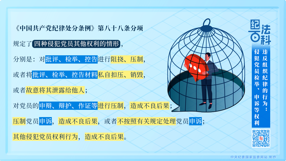 《中國共產(chǎn)黨紀律處分條例》第八十八條分項規(guī)定了四種侵犯黨員其他權利的情形,分別是:對批評、檢舉、控告進行阻撓、壓制,或者將批評、檢舉、控告材料私自扣壓、銷毀,或者故意將其泄露給他人;對黨員的申辯、辯護、作證等進行壓制,造成不良后果;壓制黨員申訴,造成不良后果,或者不按照有關規(guī)定處理黨員申訴;其他侵犯黨員權利行為,造成不良后果。