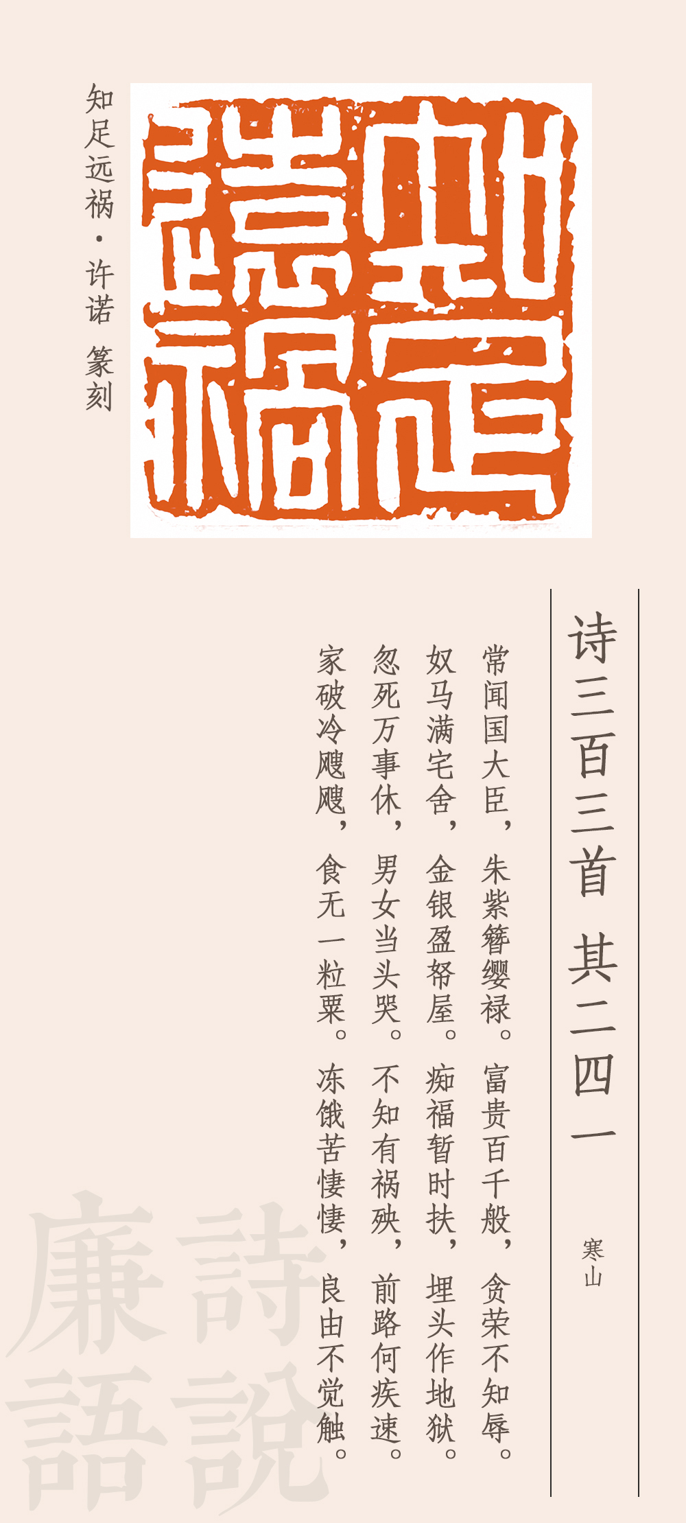 這首詩是諷刺高官貪圖富貴、聚斂財(cái)物的。他說,有些國之大臣,穿戴尊榮,好不威風(fēng),享受千般榮華富貴,卻一點(diǎn)兒都不顧及廉恥榮辱,家中擁有大量駿馬奴仆,屋子里堆滿金銀財(cái)寶,自以為這是在享福,其實(shí)是在給自己挖墳?zāi)沟鬲z。一旦死去,萬事皆休,富貴是無法永久保留的。如果因貪腐而遭受禍殃,那下場就會很慘。家破人亡,挨凍受餓,凄風(fēng)苦雨,苦不堪言。最后一句卒章顯志:之所以會有這樣的遭遇和結(jié)局,是因?yàn)闆]有悟透取禍的原因。這個(gè)原因從前面所述來看,就是太貪婪、不知足。