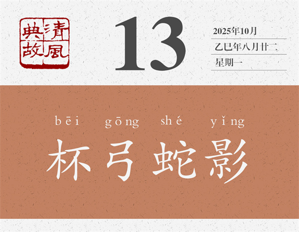 樂(lè)廣想,哪有這回事呢?當(dāng)時(shí),河南聽(tīng)事堂墻壁上掛著一張弓,上面用漆畫(huà)著一條蛇。樂(lè)廣就想,這位朋友所見(jiàn)杯中之蛇,是不是這張弓的影子呢?于是,復(fù)原了上次喝酒的現(xiàn)場(chǎng),讓客人坐在原來(lái)的位置上,將酒杯放在原來(lái)的地方上,問(wèn)他“酒中復(fù)有所見(jiàn)不”,客人說(shuō)“所見(jiàn)如初”。樂(lè)廣這才告訴他,杯中之蛇只是角弓之影而已。客人于是“豁然意解,沉疴頓愈”。后世即以“杯弓蛇影”為典,比喻疑神疑鬼,自相驚擾。明人袁宏道詩(shī)《病中和黃道元至日禪寺夢(mèng)悉詩(shī)》:“消愁莫問(wèn)弓蛇影,對(duì)境聊觀夢(mèng)幻身。”