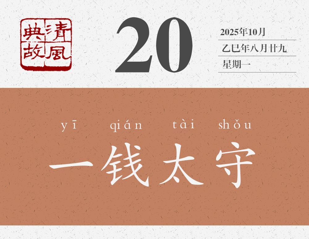 劉寵聽了他們的話說:“我的政績怎么能像您幾位說得這樣好呢?真是辛苦你們了!”為表示接受他們的美意,他從每個(gè)人帶來的錢中挑了一枚收下了。民間還流傳說,劉寵出了山陰界,就把收下的幾枚錢投進(jìn)江里,江水頓時(shí)清澈見底。從此之后,此江便被稱為錢清江。劉寵去世后,人們在江邊修了一個(gè)亭子就叫“一錢亭”,為他修建了一座廟就叫“一錢太守廟”。“一錢太守”不僅成為劉寵的稱號,也成為后世稱頌地方官員為民造福、為政清廉的典故。明人高啟詩《野老行送陳大尹》:“雞鳴相送拜道邊,愿公受取一大錢。”