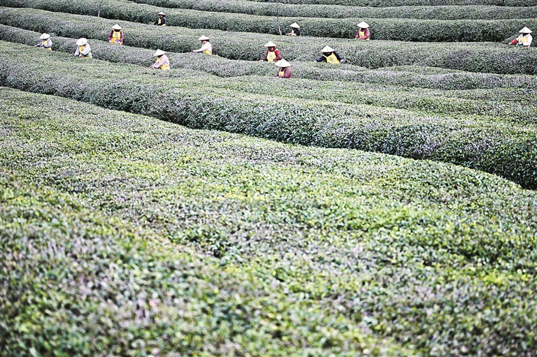 圖②:福鼎白茶文化系統(tǒng)位于福建省福鼎市,其獨(dú)特的地理位置、氣候條件和悠久歷史孕育了特有的茶樹品種和制茶技藝,以及深厚的文化內(nèi)涵。圖為福鼎市一家茶企工人在茶園采茶。(資料圖片)