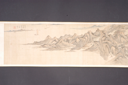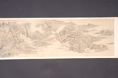 明代,設(shè)色山水長卷,作者趙左,絹本。縱高33.5厘米,橫寬230厘米??钍?ldquo;丁巳長夏仿黃鶴山樵趙左”,鈐“趙左之印”白文方印。引首孫謀書題“江村僻幽”,卷中繪萬壑千巖、奇峰危石、深澗幽谷、長河帆影、茂林煙樹、孤村崇閣、云泉溪橋……正是作者理想中的歸隱之所。趙左(1573年-1644年),明代華亭(今上海松江)人,字文度,松江派重要畫家。