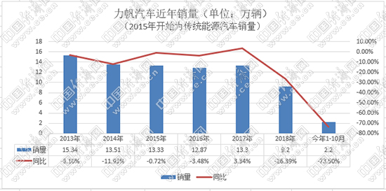 2006年,力帆推出首款轎車力帆520,新車不足5萬元的售價在當(dāng)時引發(fā)關(guān)注,月銷量一度達到5000輛。2013年,力帆年銷售汽車15.34萬輛,成為汽車界的一匹黑馬。然而,好景不長。自2016年開始,力帆汽車進入下行趨勢,目前更是步履維艱。力帆產(chǎn)銷快報顯示,2019年1-10月,力帆傳統(tǒng)乘用車累計銷售2.2萬輛,同比下滑73.5%,10月僅銷售29輛;新能源累計銷售2458輛,同比下降65.42%,10月僅銷售423輛。