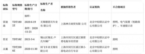 2021年上海市電動(dòng)自行車產(chǎn)品質(zhì)量監(jiān)督抽查不合格產(chǎn)品