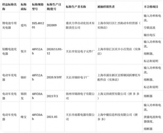 2021年長(zhǎng)三角聯(lián)動(dòng)(上海)電動(dòng)自行車用充電器產(chǎn)品質(zhì)量監(jiān)督抽查不合格產(chǎn)品