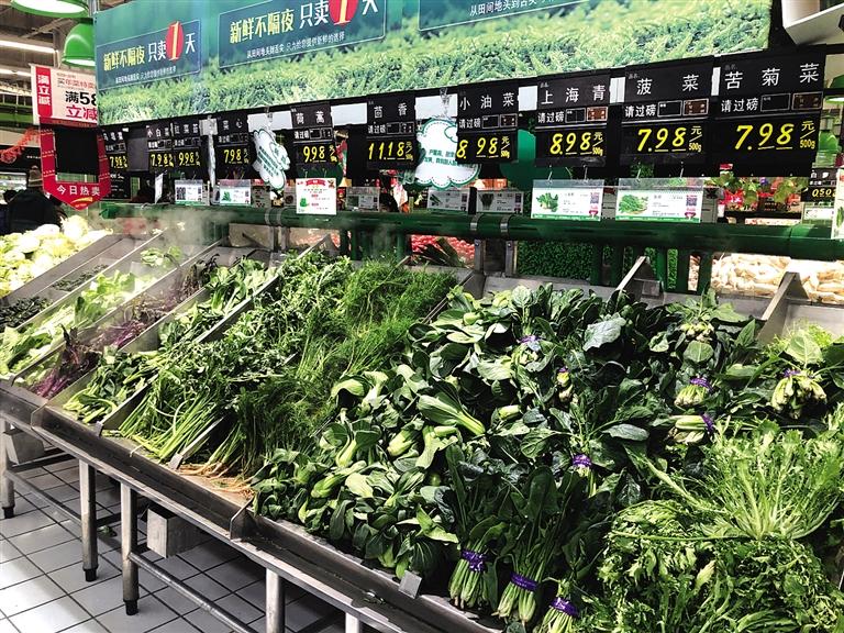 2月2日,記者在雁灘一家大型綜超看到,綠葉蔬菜每斤7元至15元,線椒每斤15.98元,白蘿卜每斤不足1元,菜花每斤2.98元。