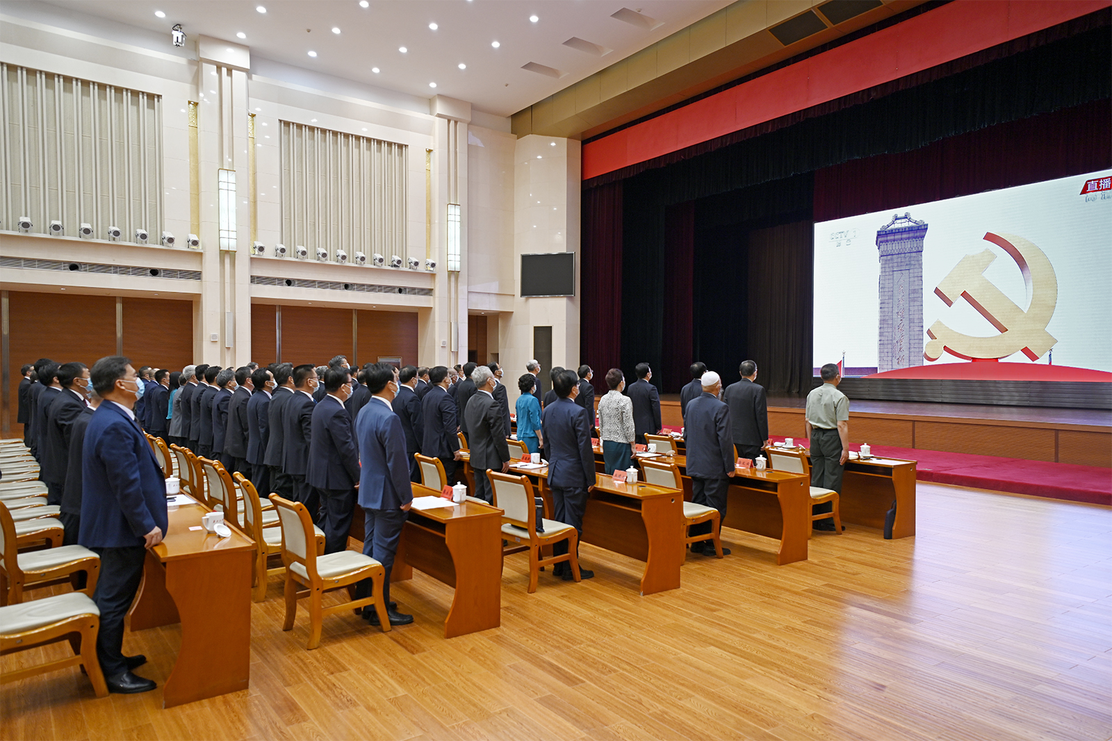尹弘、任振鶴、歐陽堅、孫偉、馬廷禮、劉昌林、胡焯、李元平、王嘉毅、石謀軍、蒲永能、朱天舒,嘉木樣·洛桑久美·圖丹卻吉尼瑪、馬青林、陳克恭、吳明明,張世珍、李沛興、何偉、余建、程曉波、劉長根、張錦剛,陳青、德哇倉、馬文云、王銳、郭承錄、康國璽、尚勛武、贠建民、郭天康、霍衛(wèi)平、袁占亭,張海波、朱玉,馬小潔,以及李德新、李志勛、王建太參加收看。