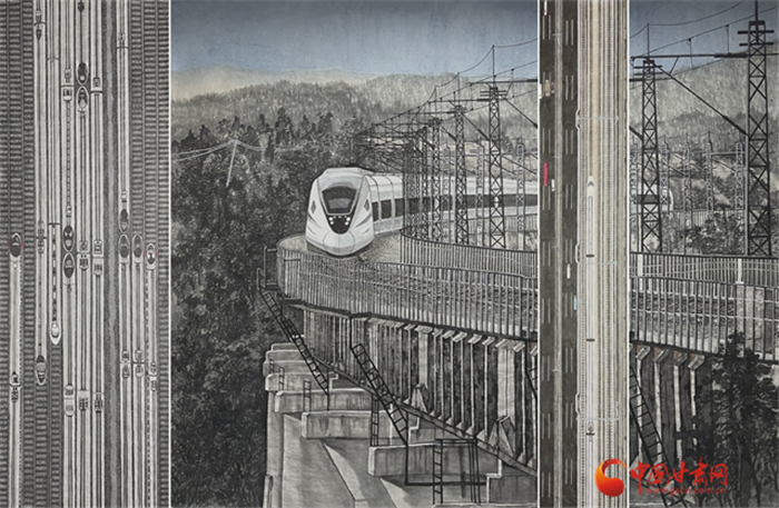 由甘肅畫(huà)院青年畫(huà)院劉峰至創(chuàng)作的國(guó)畫(huà)《中國(guó)高鐵進(jìn)大山》