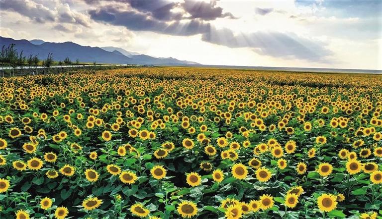 時(shí)下,位于白銀市景泰縣寺灘鄉(xiāng)境內(nèi)的永泰川戈壁灘,萬畝滴灌的旱砂田里葵花盛開,斜陽之下猶如一幅金色畫卷。