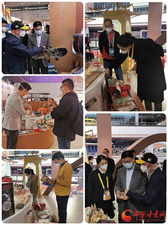 此次在酒泉展臺上展出的有極樂系列滑板、雙截棍、九色鹿系列胸針、手提包、伎樂天系列鑰匙扣、冰箱貼、飛天系列抱枕、書簽等,新潮的文創(chuàng)產(chǎn)品也拉近了敦煌文化與當代人的距離,也吸引了眾多參展商和媒體記者駐足參觀和拍攝報道。