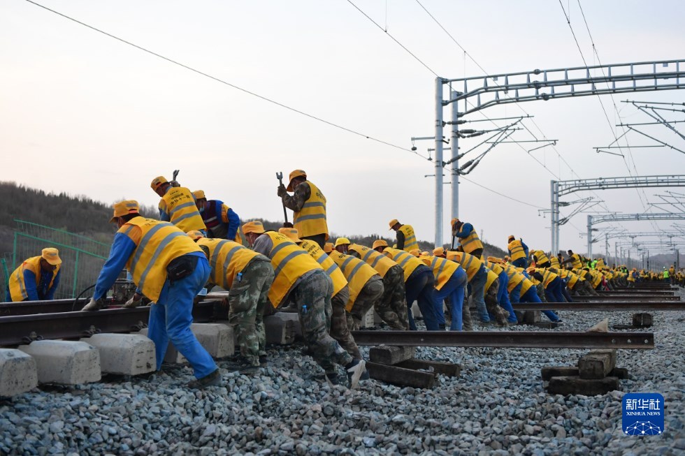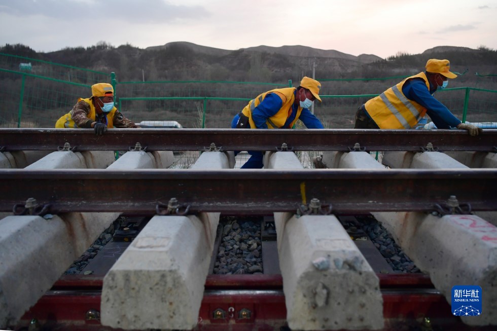 中鐵十一局建設(shè)者在中蘭客專(甘肅段)接入中川城際鐵路道岔插鋪施工現(xiàn)場作業(yè)(4月26日攝)。新華社記者 陳斌 攝