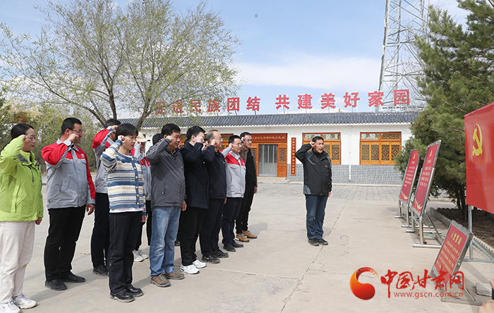 中國甘肅網(wǎng)和中鐵二十局市政公司黨員在八步沙紀(jì)念館莊嚴(yán)宣誓,重溫入黨誓詞。汲取“困難面前不低頭,敢把沙漠變綠洲”的八步沙精神力量。
