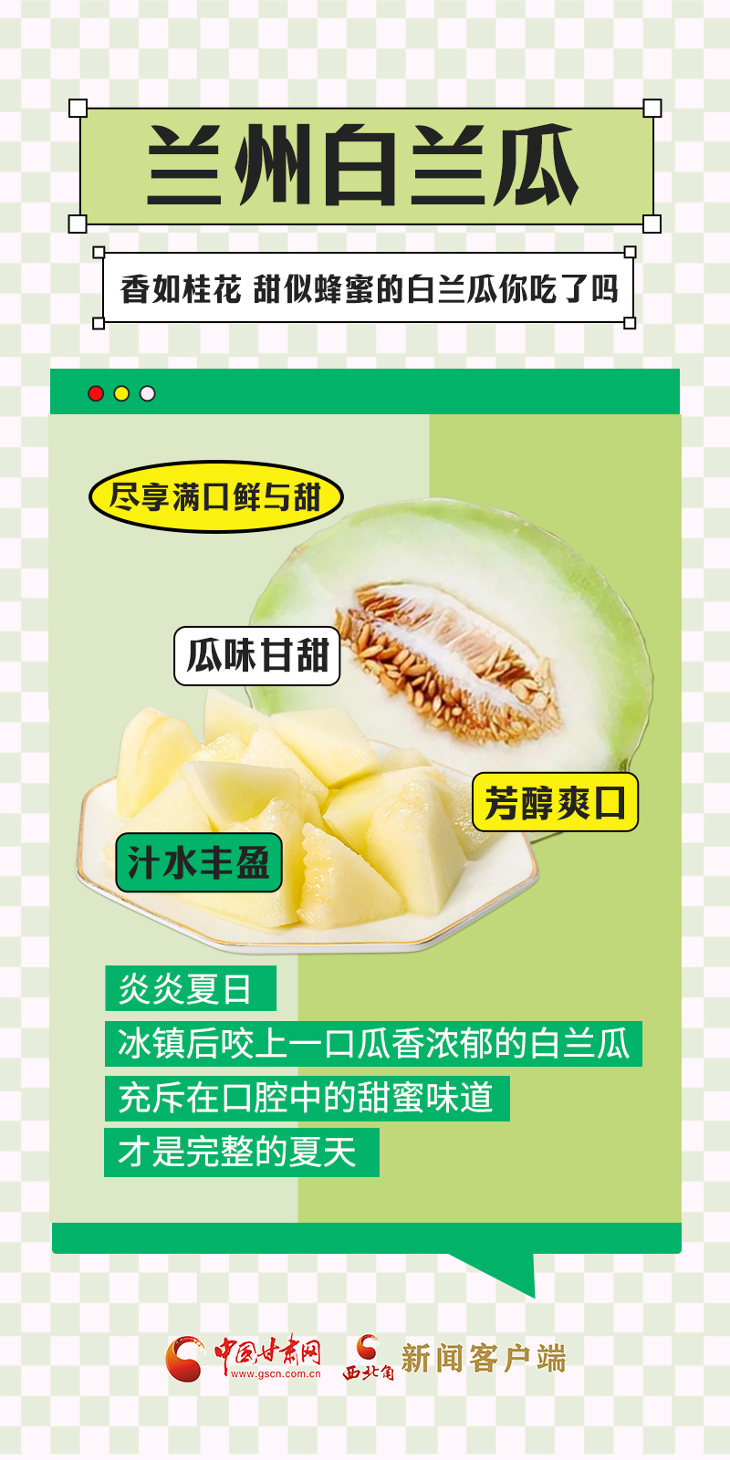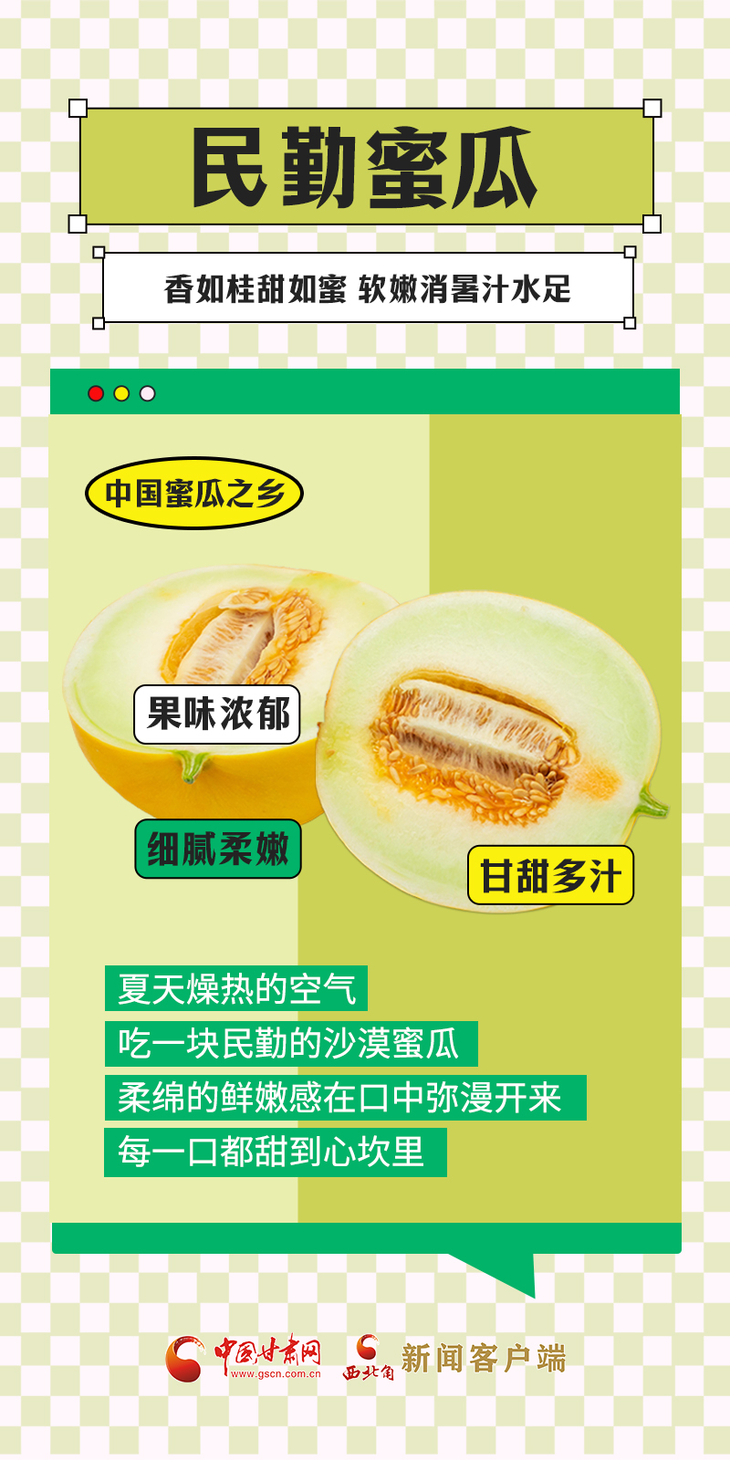 甘肅是中國自然地理多樣的省份,從隴南一直到敦煌,跨越了三大高原地帶、四大氣候類型,日照充足、干燥多風(fēng)、降水量少、晝夜溫差大,這種獨特的氣候特點,十分適宜水果的生長。盛夏時節(jié),甘肅各地時令瓜果陸續(xù)上市,不僅豐富了百姓的“果盤子”,也鼓起了農(nóng)民的“錢袋子”。“瓜果經(jīng)濟(jì)”在隴原大地上助力鄉(xiāng)村振興。