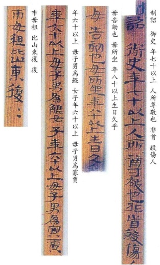 1981年出土于武威磨嘴子漢墓中的“王杖詔書令冊”簡則是關(guān)于古代敬老養(yǎng)老制度的法律法規(guī),堪稱古代“老年人權(quán)益保護(hù)法”。原簡背面有編號(hào)第一至第廿七,共27簡,但第15簡已缺失,余26簡首尾俱全。正面有556個(gè)字,雖歷經(jīng)千年,上面墨書的漢隸依然清晰可見。簡文內(nèi)容豐富,記載明確,既有撫恤鰥寡孤獨(dú)廢疾之人的具體做法,又有敬老養(yǎng)老高年賜王杖的明確規(guī)定。