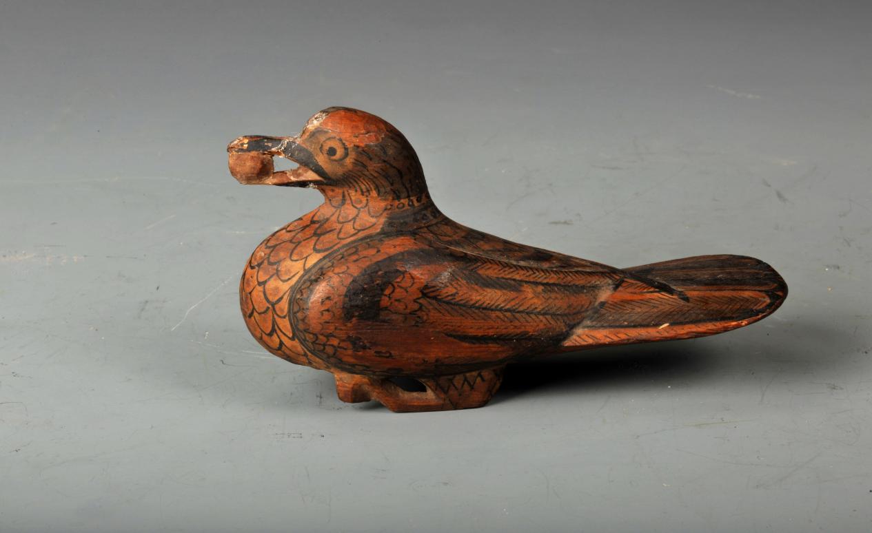 木鳩是王杖的杖首。在武威市博物館里,就有一件國寶級(jí)文物漢代彩繪漆木鳩:一只臥姿木質(zhì)鳩鳥,雙目平視,口中含物,兩翼收攏于背部,尾呈平行片狀,兩足曲伸,中有方形卯,為杖桿接榫處。通體墨彩繪制,從頸至腹繪魚鱗狀羽毛,兩翼及尾上部繪魚骨狀羽毛。《后漢書·禮儀志》中記載:“王杖長九尺,端以鳩鳥為飾。鳩者,不噎之鳥也。欲老人不噎。”,“鳩”同于漢字“九”,有九九長壽的寓意;鳩鳥被稱為不噎之鳥,表達(dá)了對(duì)老人吃飯不噎、身體康健的美好祝愿。