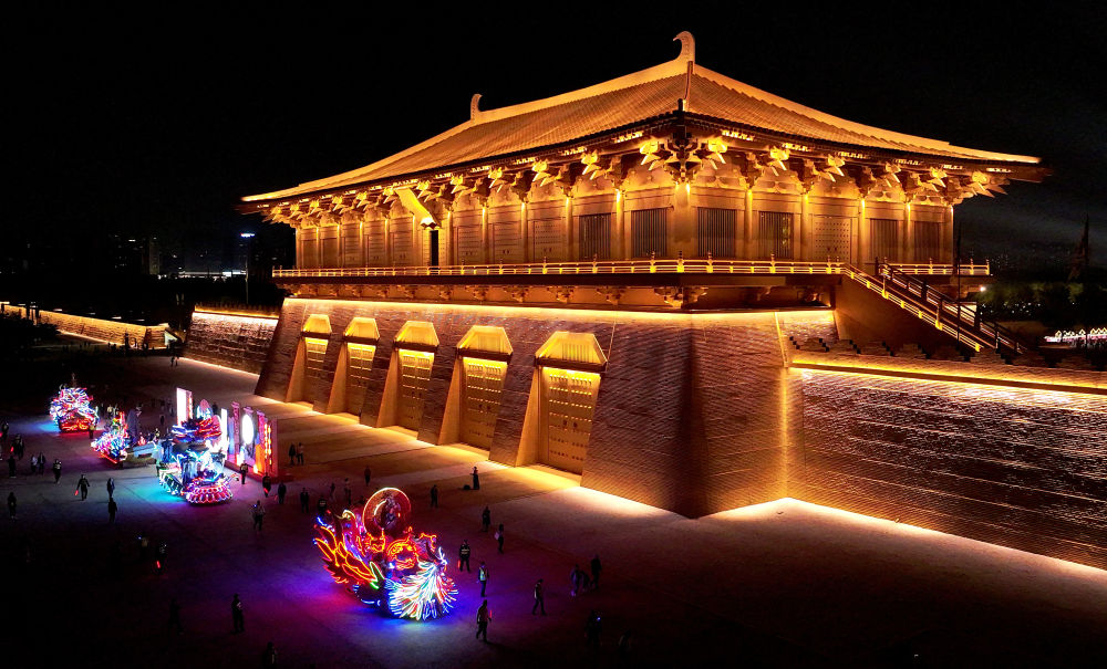 巡游彩車從西安大明宮國(guó)家遺址公園丹鳳門前駛過(guò)(2023年9月30日攝,無(wú)人機(jī)照片)。新華社記者 劉瀟 攝