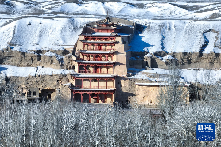 12月15日,甘肅省敦煌市迎來(lái)降雪天氣。雪后的世界文化遺產(chǎn)敦煌莫高窟銀裝素裹,景色如畫。新華每日電訊記者 郎兵兵 攝