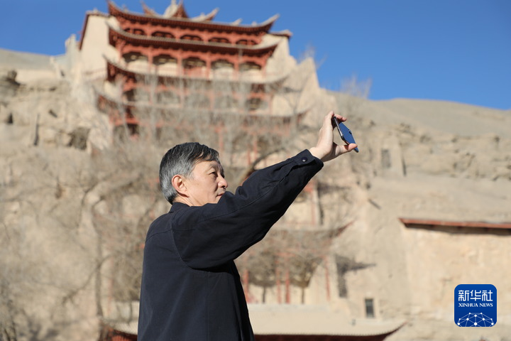 2022年2月23日 敦煌研究院院長(zhǎng)蘇伯民正在用手機(jī)進(jìn)行“數(shù)字敦煌”體驗(yàn)。新華每日電訊記者 張睿 攝