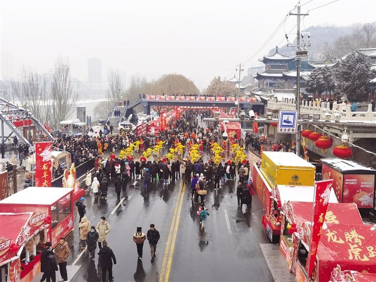 中國甘肅網(wǎng)2月3日訊 據(jù)蘭州晚報報道 2月2日北方小年當(dāng)天,黃河市集在北濱河路白塔山公園門前熱鬧開市?,F(xiàn)場,大紅燈籠高高懸掛、福字帳篷年味滿滿,紅柳烤肉、冰糖雪梨、糖葫蘆、糖畫、牛奶雞蛋醪糟、丁娃燒餅等特色小吃攪動著市民游客的味蕾;民間手藝人制作的非遺手工藝品、洮硯、傳統(tǒng)絨花做工精巧,吸引了許多人駐足欣賞;太平鼓、舞獅等表演在市場上掀起了高潮,許多市民游客上前摸摸獅子討個好彩頭,在小年這天沉浸式體驗了新春市集里的幸福煙火氣息。