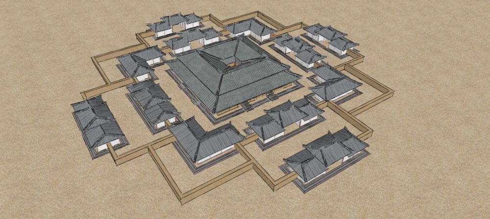 遺址結(jié)構(gòu)清晰——以中心夯土臺(tái)基為中心,東西南北各有兩組并行對(duì)稱的長(zhǎng)方形附屬建筑,四角分布曲尺形附屬建筑。殘留建筑遺跡面積近9000平方米。