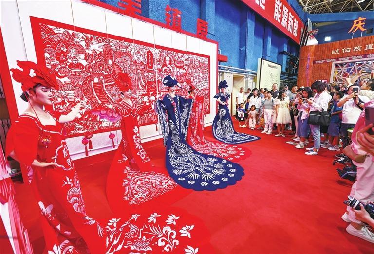 鎮(zhèn)原縣展館推出的剪紙元素服裝吸引大量游客駐足參觀。陳飛
