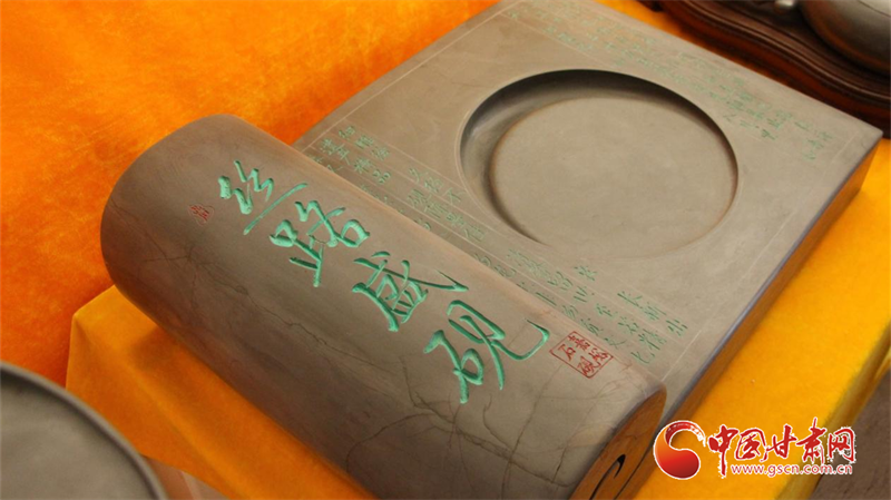 嘉峪石硯,取材于嘉峪山后的黑山峽深處,故又稱(chēng)“黑山石硯”,是目前所知最早的古石硯之一。這種石硯質(zhì)堅(jiān)而細(xì)、扣之有聲,發(fā)墨快而不損毫,儲(chǔ)墨久而不干,“有史記載的三百多種石硯中,只有嘉峪石硯是帶有銘文出土的。這對(duì)于石硯的研究具有重要的史料價(jià)值。”劉宗學(xué)向?qū)嵺`團(tuán)成員系統(tǒng)地講述了嘉峪石硯的傳承歷史,并展示了自己以絲綢之路為主題創(chuàng)作的“絲路盛硯”組合石硯。這套石硯主要以甘肅十四個(gè)地州市的建筑、景觀、歷史人物為內(nèi)容,體現(xiàn)了甘肅省的根脈文化、黃河文化、長(zhǎng)城文化、絲路文化、紅色文化等五大文化,表現(xiàn)出甘肅在絲綢之路經(jīng)濟(jì)發(fā)展與文化交流中的重要作用。