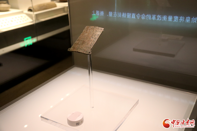 中國甘肅網(wǎng)9月14日訊(西北角·中國甘肅網(wǎng)記者 孫珩力)秦詔版,是指刻有秦始皇或秦二世統(tǒng)一度量衡詔書的銅版,有的鑲在鐵權(quán)、銅權(quán)上;有的四角有孔,用以釘在木頭的量器上。目前我國出土的刻有秦始皇詔文的遺物有銅橢量、銅錢等,不僅數(shù)量多而且分布也廣,而像這樣把詔文刻在銅版上的詔版形式在全國極為罕見,鎮(zhèn)原縣博物館收藏的就是其中之一,可謂稀世珍品。