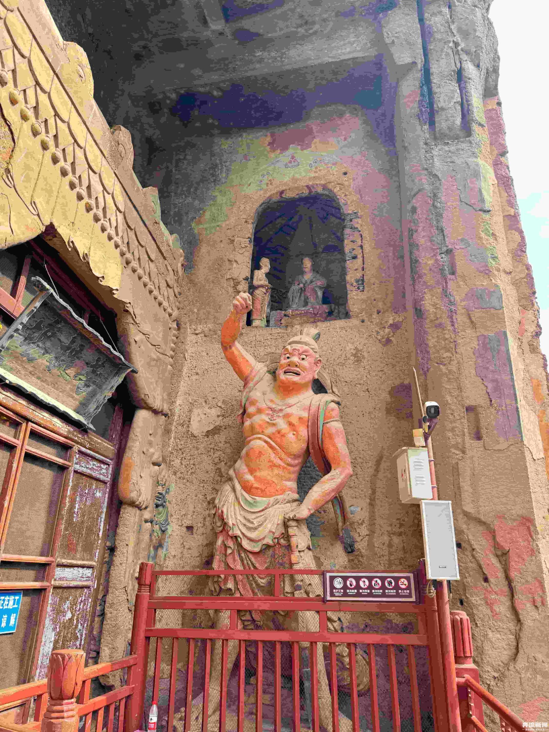 形如麥垛的山體之上,窟龕如同蜂窩般密密麻麻分布在絕壁之上。麥積山石窟始鑿于十六國(guó)后秦時(shí)期,現(xiàn)存大小窟龕221個(gè),造像3938件10632身,壁畫近1000平方米。