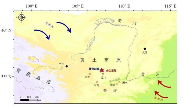 南佐遺址和帥堡剖面地理位置及所受季風影響示意圖。韓建業(yè) 供圖