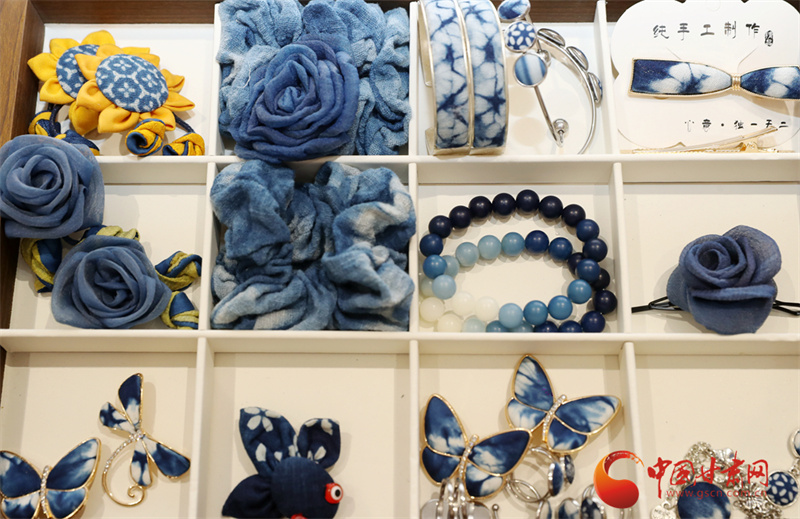 染好的布匹還要經(jīng)過脫漿、清洗、陰干,最后才是拆線、整理。當(dāng)一塊完整的藍(lán)印花布展現(xiàn)在眼前時,李梅總會輕輕撫摸布料,仿佛在與草木對話。她的工作室里,掛滿了用藍(lán)染制成的物件:桌布上印著成片的板藍(lán)根葉,茶席邊緣綴著小巧的藍(lán)染布扣,就連她日常穿的棉麻衫,也是自己染的淡藍(lán)色。“這些布不是冰冷的商品,是帶著土地溫度的生活。”李梅說,去年她在平?jīng)龉懦情_了一間“藍(lán)染生活館”,游客可以跟著她學(xué)種板藍(lán)根、體驗(yàn)扎染,很多人第一次發(fā)現(xiàn),原來衣服上的藍(lán)色可以來自田野,非遺技藝能如此貼近日常。
