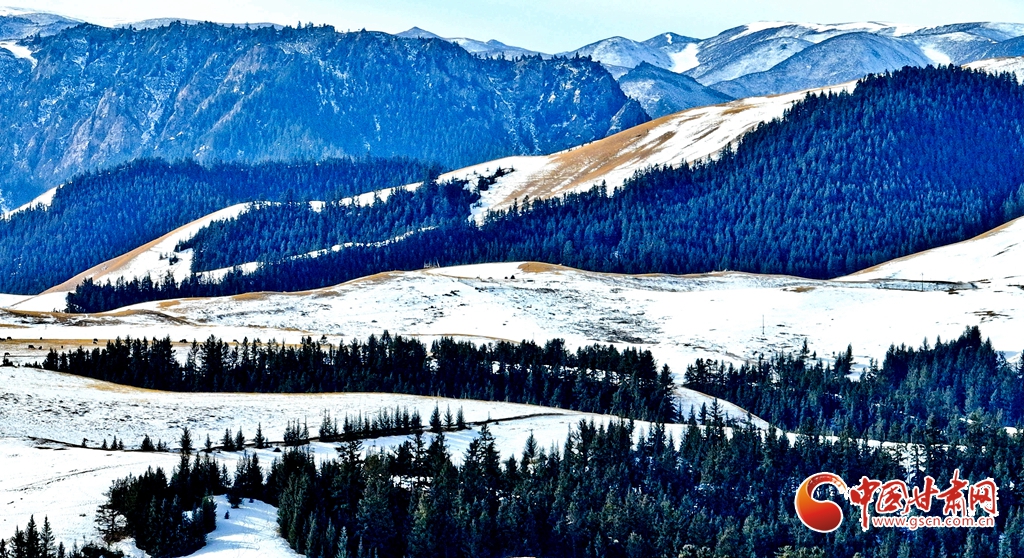 1月24日雪后初霽,肅南裕固族自治縣境內(nèi)的祁連山銀裝素裹,云霧繚繞。雪山、峽谷、森林、草原在皚皚白雪中交相輝映,冬意盎然。牛群、馬群與羊羔在雪中草原上靜靜的覓食,勾勒出一幅人與自然和諧共生的壯美畫卷。