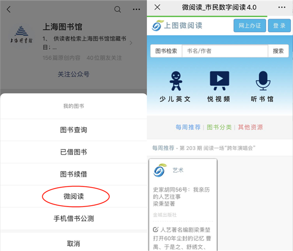 凡是擁有上海圖書館讀者證的讀者,即可登錄上海圖書館提供遠程服務的數據庫,或者已經開通的虛擬讀者證也可以訪問“微閱讀”電子資源。關注上海圖書館公眾號后,通過微信菜單:“我的圖書”——“微閱讀”。