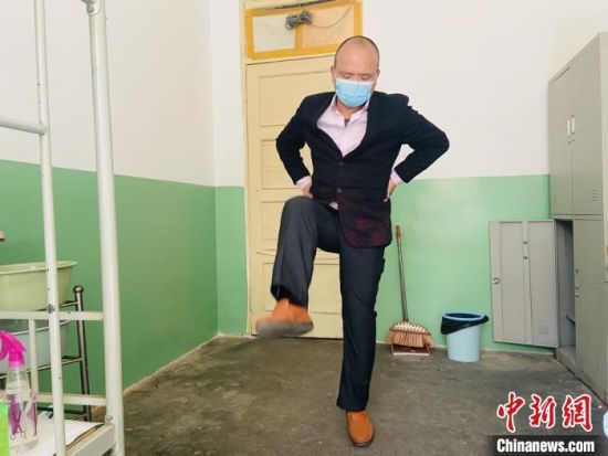 圖為郭平安在宿舍里做廣播體操。 高康迪 攝