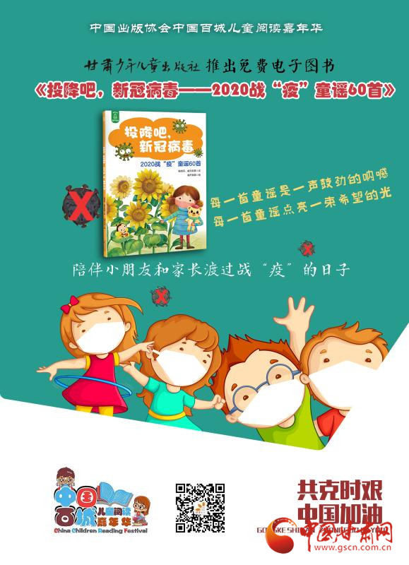 庚子之春,新冠肺炎疫情爆發(fā),全國(guó)人民奮力投身到這場(chǎng)疫情防控阻擊戰(zhàn)中,孩子們、兒童文學(xué)作家也紛紛創(chuàng)作了大量?jī)?yōu)秀的童謠。2月份,讀者出版集團(tuán)旗下甘肅少年兒童出版社(以下簡(jiǎn)稱:甘肅少兒社),策劃上線了免費(fèi)公益數(shù)字出版物《投降吧,新冠病毒——2020戰(zhàn)“疫”童謠60首》。書中收錄60首優(yōu)秀童謠作品,對(duì)兒童進(jìn)行防疫科普宣傳,以期提高兒童科學(xué)防護(hù)意識(shí)和戰(zhàn)勝病毒的信心。一首首童謠匯集起來(lái),架起了孩子和家長(zhǎng)共同抗疫的橋梁,也點(diǎn)亮了孩子們用稚嫩的眼光和思維認(rèn)識(shí)這場(chǎng)災(zāi)難的微光。