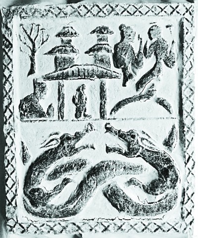 四川漢畫(huà)像石拓片,右上方為人首蛇身的伏羲女?huà)z。圖片選自《吾國(guó)與吾名——中國(guó)歷代國(guó)號(hào)與古今名稱研究》
