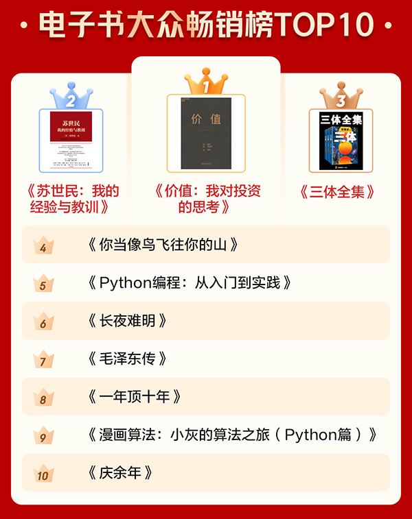 通過(guò)電子書(shū)暢銷(xiāo)榜TOP10和有聲暢銷(xiāo)榜TOP10可以看出,很多人愈發(fā)關(guān)注投資和管理等方面的內(nèi)容,也愈發(fā)注重個(gè)人學(xué)習(xí)。《價(jià)值:我對(duì)投資的思考》《蘇世民:我的經(jīng)驗(yàn)與教訓(xùn)》 分別位居電子書(shū)暢銷(xiāo)榜第一名和第二名。《中國(guó)經(jīng)濟(jì)2020》《原則》進(jìn)入有聲暢銷(xiāo)榜前十。此外,學(xué)習(xí)類(lèi)圖書(shū)《Python編程:從入門(mén)到實(shí)踐》《漫畫(huà)算法:小灰的算法之旅(Python篇)》也上榜電子書(shū)暢銷(xiāo)榜前十。