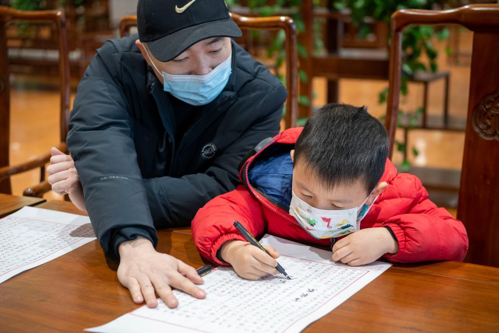 2月6日,小朋友和家長在太原市圖書館參加“觀四庫 抄經典”活動。