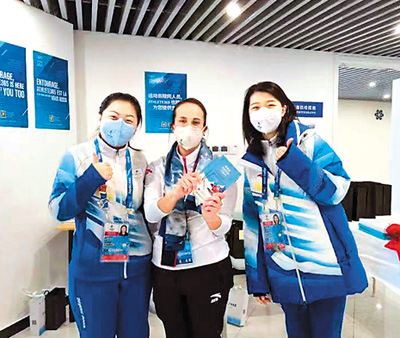來自北京語言大學的志愿者向國際奧委會官員(中)贈送《冬奧會交際漢語口袋書》。