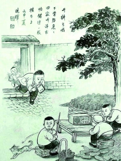 劉現(xiàn)輝的一套四冊(cè)繪畫作品《童年那些事兒》(花山文藝出版社出版),就是一次目光穿越時(shí)光阻隔,對(duì)童年和故鄉(xiāng)的深情佇望。經(jīng)由長(zhǎng)久而專注的凝視,一縷縷游絲般輕淡的鄉(xiāng)思,逐漸擴(kuò)展匯聚成一種濃郁的故土深情,仿佛滿天云錦,在靈魂的天空閃現(xiàn)著動(dòng)人的光華。