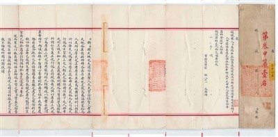 來(lái)自鎮(zhèn)江市圖書(shū)館的《封贈(zèng)文藻父母誥命》是清廷頒給張家口左翼正白旗滿洲四品銜驍騎校文藻父母的誥命,內(nèi)容為封賜文藻之父賡吉圖為昭武都尉,其母額哲特氏為恭人。這幅圣旨由黃、赤、紫三色錦織就,卷頭和卷尾分別織有漢、滿文“奉天誥命”4字,字兩旁有升龍和降龍盤繞紋樣。此誥命的制誥時(shí)間為光緒三十四年(1908年)十一月初九,當(dāng)時(shí)光緒帝已經(jīng)去世,宣統(tǒng)帝于此日即位。