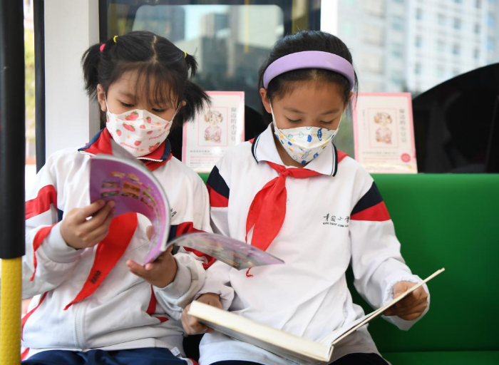 11月10日,學生在長沙市青園友誼小學巴士圖書館內閱讀。