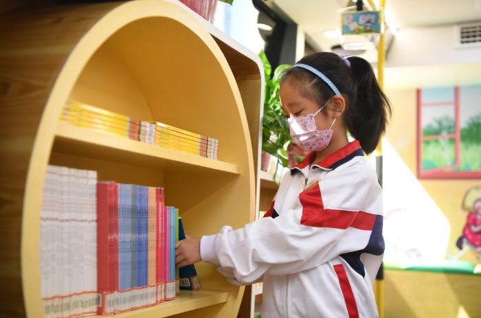 11月10日,學生在長沙市青園友誼小學巴士圖書館內上繪本閱讀課。