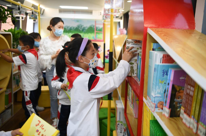 11月10日,學生在長沙市青園友誼小學巴士圖書館內歸還圖書。