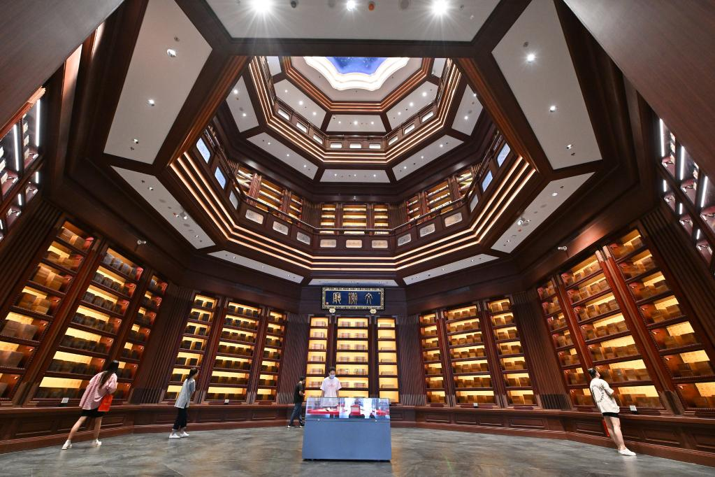 2022年7月30日,觀眾在中國國家版本館中央總館文瀚廳內(nèi)參觀。中國國家版本館是國家版本資源總庫和中華文化種子基因庫,由中央總館文瀚閣、西安分館文濟(jì)閣、杭州分館文潤閣、廣州分館文沁閣組成,歷時三年建設(shè),全面履行國家版本資源保藏傳承的職責(zé)。