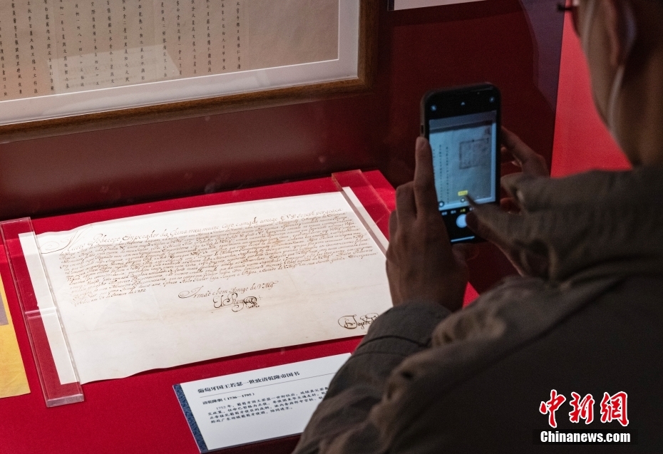 圖為“明清檔案”展區(qū)內(nèi)展示的“葡萄牙國王若瑟一世致清乾隆帝國書”展品吸引觀眾用手機記錄。 中新社記者 侯宇 攝
