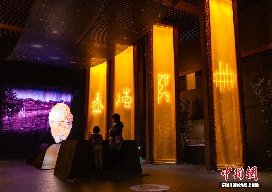 圖為“殷墟甲骨”展區(qū)內(nèi)的聲光互動區(qū)吸引觀眾體驗。 中新社記者 侯宇 攝