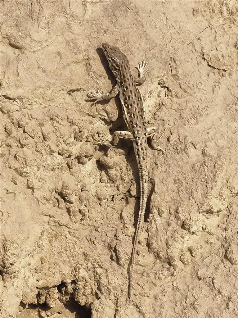 即將到達(dá)山頂,腳底下發(fā)現(xiàn)了亂竄的小蜥蜴。這是當(dāng)?shù)爻R姷囊环N小蜥蜴,就是壁虎,當(dāng)?shù)厝朔Q為蝎虎子、七寸子。土皮色,半厘米粗,5至10厘米長,跑的很快,有很強(qiáng)的自我保護(hù)意識(shí)。若被人或獵食者抓住尾巴,會(huì)主動(dòng)斷掉尾巴逃跑,后在不到一個(gè)月的時(shí)間內(nèi),長出新尾巴。盡管有此本領(lǐng),但往往還是鷹和烏鴉等食肉飛禽及蛇的獵物。