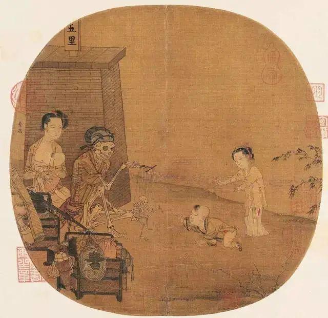 在這幅團(tuán)扇大小的畫(huà)面中,李嵩描繪了一幅傀儡戲的演出場(chǎng)景,一幅披衣戴帽的大骷髏,操縱著線板,指揮著一幅小骷髏在表演各種動(dòng)作。一個(gè)嬰兒好奇地爬向那個(gè)表演中的骷髏小傀儡……活人與骷髏、生與死,同時(shí)出現(xiàn)于畫(huà)面中,在中國(guó)古畫(huà)里是極罕有的,也因此引起了后世的種種猜測(cè)解讀。