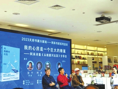 2023天府書展,各種名家分享會讓讀者應(yīng)接不暇。除了成都世紀(jì)城新會展中心主會場,分會場的活動(dòng)也精彩紛呈。10月15日下午,在西部文化產(chǎn)業(yè)中心阿來書房,阿來、葉舟、梁平三位名家開啟“我的心房是一個(gè)巨大的蜂巢——阿來詩集《從梭磨河出發(fā)》分享會”。三人上演老友記,分享會由阿來的青春期談起,氛圍詼諧幽默、愜意深情。
